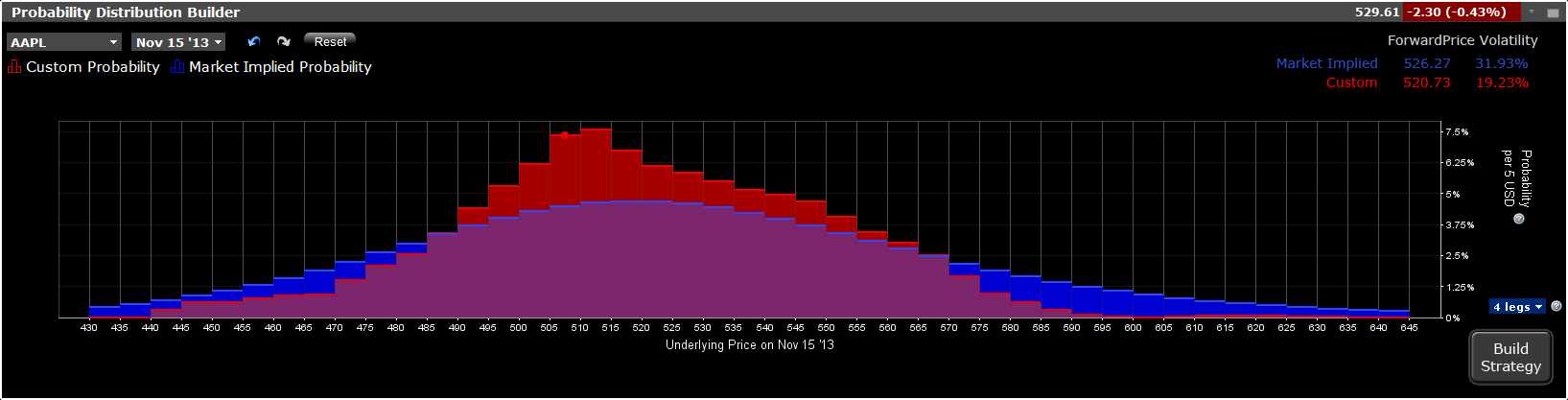 Please go ahead and play with the PD by dragging the distribution bars below. We display combination trades that are likely to have favorable outcomes under your PD. You can specify if you would like to see the "optimal trades" that are a combination of up to two, three or four option legs. We will show you the three best combination trades along with the corresponding expected profit, Sharpe ratio, net debit or credit, percentage likelihood of profit, maximum profit and maximum loss and associated probabilities for each trade, given your PD, and the margin requirement.