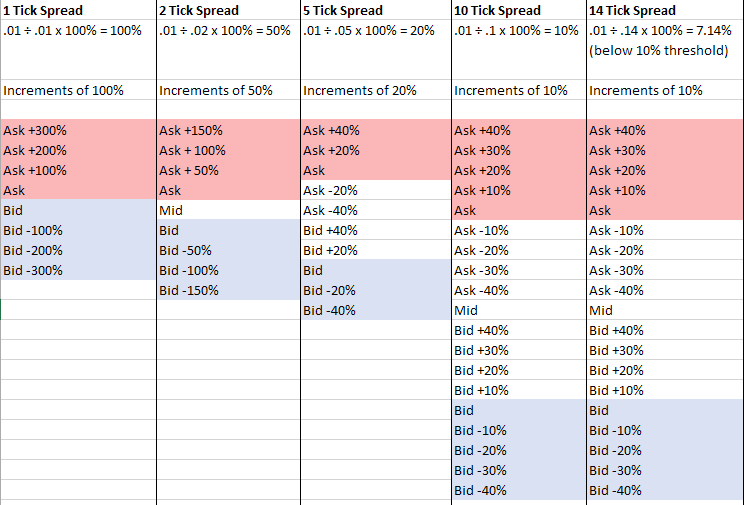 In other words, when the bid/ask spread is 1 tick wide, that 1 tick is 100% of the spread. If the spread is 5 ticks wide, each tick is 20% of the spread. Wider spreads offer more price increments between the bid and ask prices. In cases where the spread is wide, the increments for absolute prices will not be the same as the increments for relative prices (since we round once the spread ratio is less than 10%).